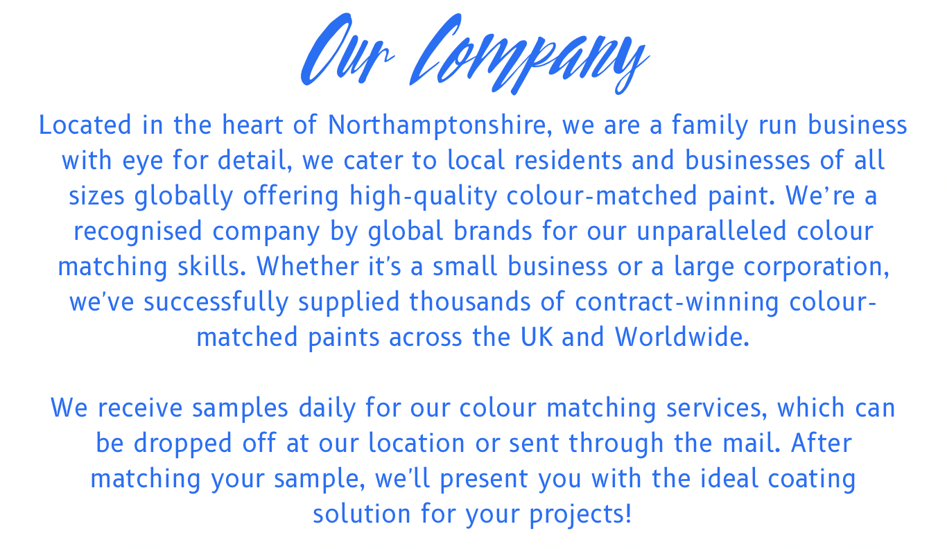 - Additionally, if an existing colour has faded over time and needs to be matched to the changed shade, we can help. Our colour matching process takes into account the specific requirements of your project, ensuring that the final result is a seamless match.